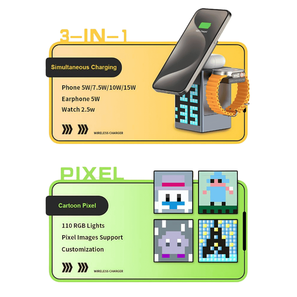 3-in-1 Magnetic Charger & Clock with wireless charging for iPhone, AirPods, Apple Watch, Bluetooth speaker, RGB LED display, MagSafe, and alarm clock.