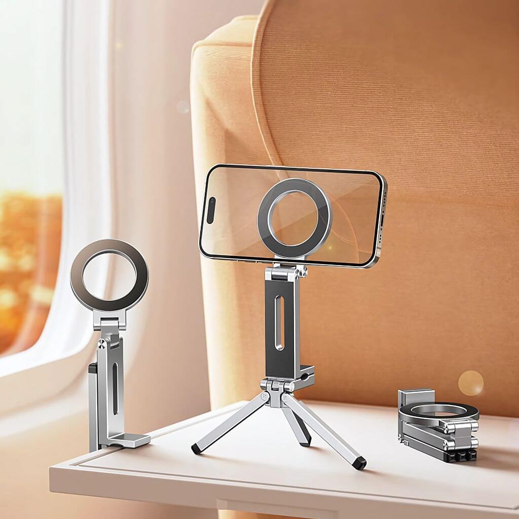 Clamp it, stand it, or hold it—this foldable mount goes from desk to car to plane to luggage in seconds.